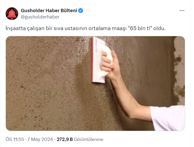X Sosyal Medya’da 349,5 bin Gusholder Haber Bülteni resmi hesabı https://twitter.com/gusholderhaber üzerinden yaptığı paylaşımda inşaatta çalışan bir sıva ustasının ortalama maaşının 65 bin TL olduğunu açıkladı.