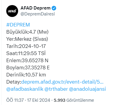 AFAD, Sivas Merkez'de saat 11:29'da 4.7 şiddetinde deprem meydana geldiğini duyurdu.