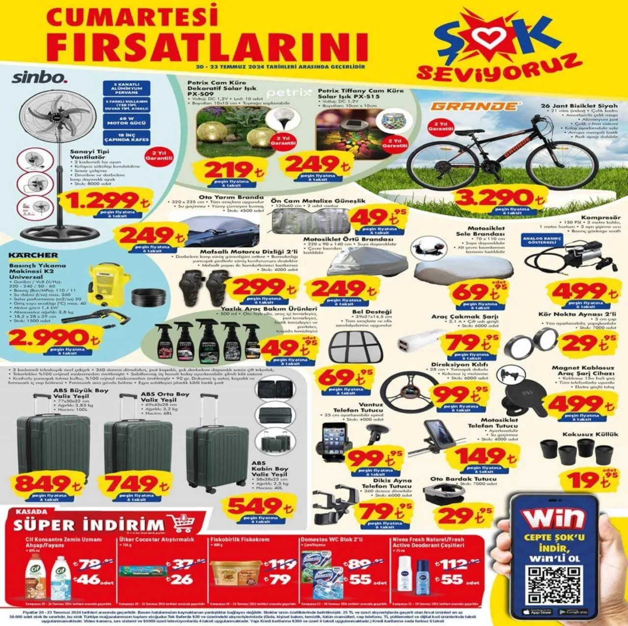 ŞOK Markette 20 Temmuz'da onlarca indirimli sizleri bekliyor. Bu cumartesi ŞOK'ta Grande 26 Jant Bisiklet 3.290 Türk Lirası, Motosiklet Örtü Brandası 249 Türk Lirası, 500 ml Yazlık Araç Bakım Ürünleri 49,95 Türk Lirası.