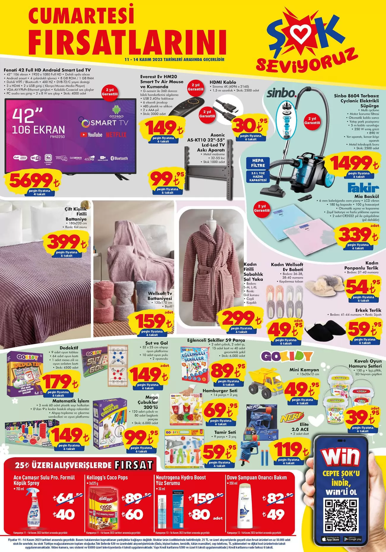 ŞOK Market 11-14 Kasım tarihleri arasında geçerli olacak indirimli aktüel ürünler kataloğunu yayımladı. Her hafta ŞOK tarafından paylaşılan aktüel ürünler kataloğunda bebek beşiği, elektrikli süpürge, Fenoti 42" Full HD Android Smart Led Tv, Fakir Mia Baskül, HDMI Kablo gibi ürünler yer aldı. Öte yandan ŞOK'ta 25 TL üstü alışverişlerde 700 ml Ace Çamaşır Sulu Pro Formül Köpük Sprey 40 liraya, 3x225 gram Kellog's Coco Pops 60 liraya, 30 ml Neutrogena Hydro Boost Yüz Serumu 80 liraya ve 350 ml Dove Onarıcı Bakım Şampuan 49 liraya indirimli fiyatla satışa çıkarılacak.