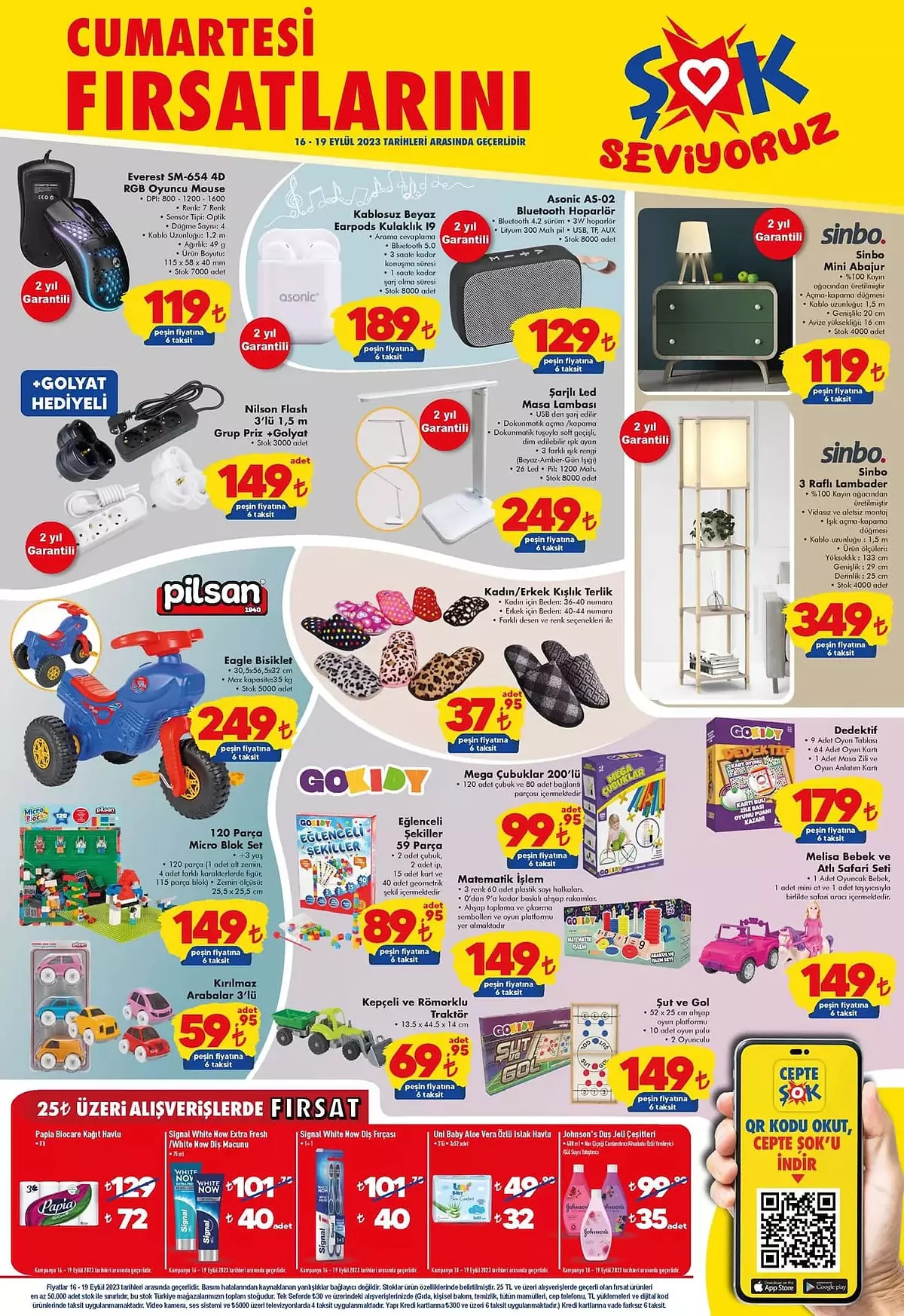 ŞOK Market, 16 Eylül-19 Eylül tarihleri arasında geçerli olacak indirim kampanyasına ilişkin aktüel ürünler kataloğunu resmi internet sitesinden yayımladı. Bu kapsamda, bulaşık makinesinden saç maşasına, kâğıt havludan diş fırçasına kadar hemen her alandaki ürün indirime girdi.