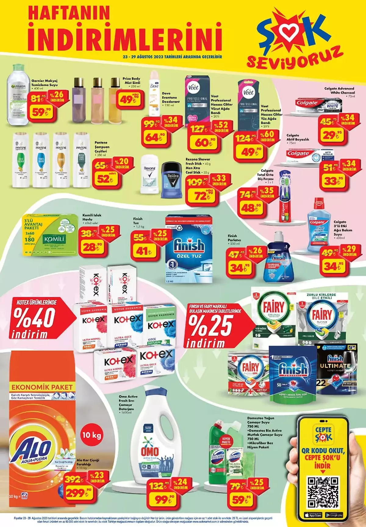 Türkiye’nin hemen her ilçesinde şubesi bulunan ŞOK, indirimlerini de ülkenin doğusundan batısına her yere ulaştırıyor. Buna göre, ŞOK’ta şampuandan makyaj temizleyiciye, robot süpürgeden ıslak havluya kadar hemen her ürün indirime girdi.