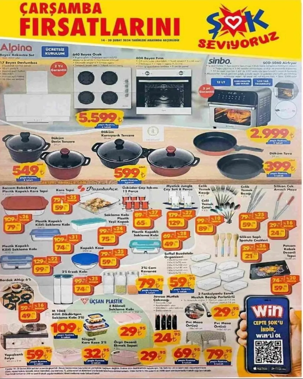 ŞOK Marketler zinciri 14 Şubat 2024 aktüel ürünler kataloğunu paylaştı. Buna göre, yarın çeşitli ürünlerde indirim fırsatı sunuluyor. Sinbo Airfryer 2.999 TL, 6'lı Çelik Yemek Kaşığı / Çatalı 89,95 TL, 120x170 cm Koza Hai Peluş Halı 699 TL.