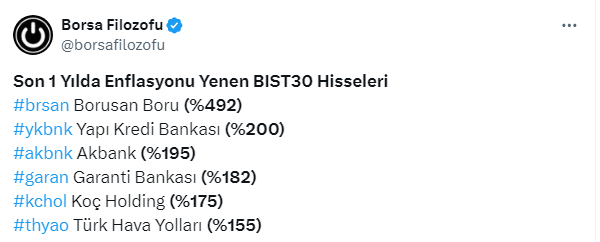 Borsa İstanbul’da son bir yılda birçok hisse yatırımcısına kaybettirirken, kazandıranlar da oldu. Herkesin yükseliş beklediği süreçte, Borsa Filozofu https://twitter.com/borsafilozofu X sosyal medya hesabından son 1 yılda enflasyonu yenen BIST 30 hisselerini paylaştı. İşte 0 liste:
