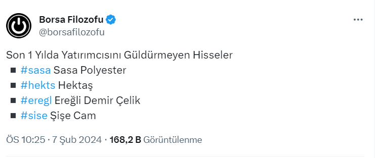 224,4 bin takipçili Borsa Filozu isimli kullanıcı, https://twitter.com/borsafilozofu X sosyal medya hesabı üzerinden son 1 yılda yatırımcısını güldürmeyen 4 hisseyi açıkladı.