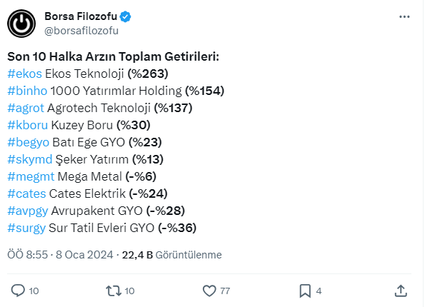 Borsa Filozofu resmi sosyal medya hesabı https://twitter.com/borsafilozofu üzerinden yaptığı paylaşımda paylaşımda son 10 halka arzın toplam getirilerini açıkladı.
