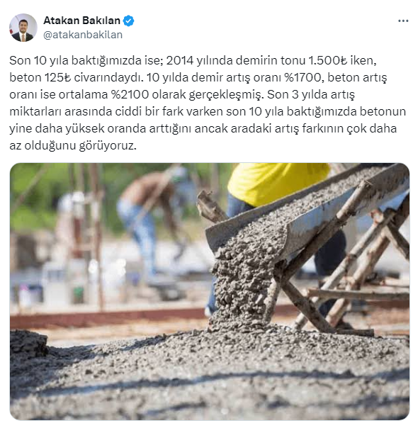 Bakılan, son 10 yılda demir fiyatlarının yüzde 1.700, beton fiyatlarının ise yüzde 2 bin 100 arttığını açıkladı. Bakılan her iki inşaat malzemelerindeki artışa değinerek, beton fiyatlarında daha yüksek artış olduğunu şu sözlerle ifade etti ' Son 3 yılda artış miktarları arasında ciddi bir fark varken son 10 yıla baktığımızda betonun yine daha yüksek oranda arttığını görüyoruz.'' dedi.