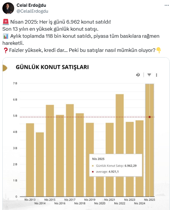 Konut satışları geçen yıla kıyasla rekor seviyelere yükselirken, Şehir Plancısı ve Gayrimenkul Değerleme Uzmanı Celal Erdoğdu'dan çarpıcı değerlendirme geldi. Konut satış rakamlarını değerlendiren Erdoğdu, Nisanda her gün 6,962 konut satıldığını ve son 13 yılın en yüksek günlük konut satışının gerçekleştiğini açıkladı.