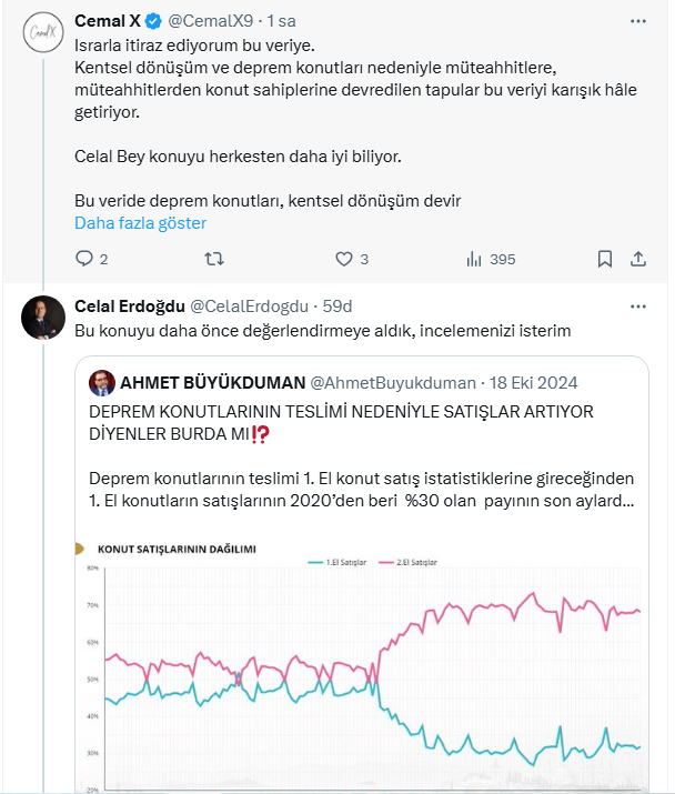 Konut piyasasının tüm baskılara rağmen hareketli olduğunu belirten Celal Erdoğdu, satışlardaki yükselişe dikkat çekti. Erdoğdu ''Faizler yüksek, kredi dar... Peki bu satışlar nasıl mümkün oluyor?'' diyerek sosyal medya hesabı X'ten günlük konut satış rakamlarının yer aldığı grafiği paylaştı.