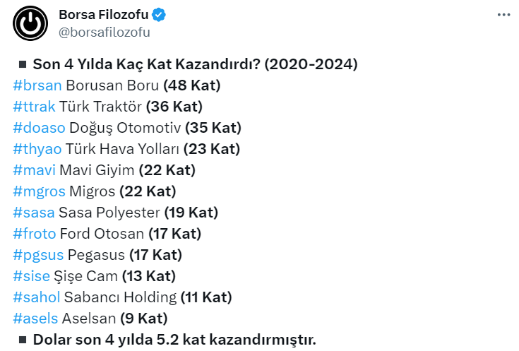 Borsa yatırımcıları hangi hissenin ne kadar kazandırdığını merak ederken, yaptığı paylaşımlarla dikkat çeken Borsa Filozofu son 4 yılda hangi hisse kaç kat kazandırdığını paylaştı. İşte o paylaşım ve paylaşıma gelen yorumlar...