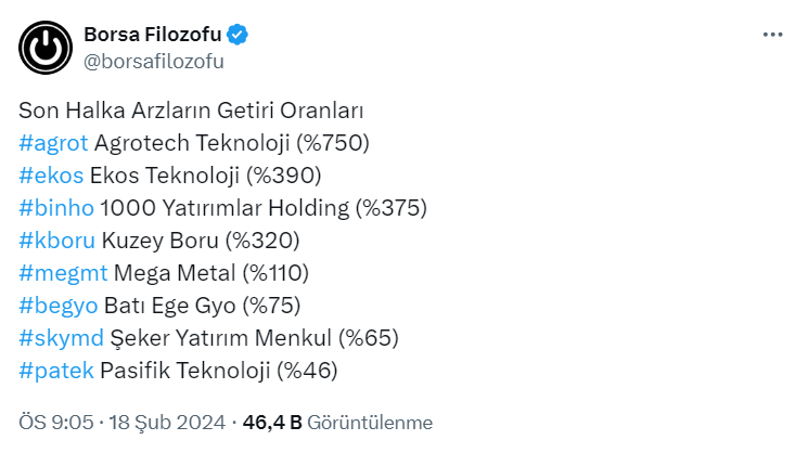Geçen yıl gerçekleşen halka arzlarda rekor yatırımcı sayısına ulaşan Borsa İstanbul’da son halka arzların getirileri de pek çok merak ediliyor. Borsa Filozofu resmi X hesabı https://twitter.com/borsafilozofu üzerinden yaptığı paylaşımda son 8 halka arzın getiri oranlarını açıkladı.