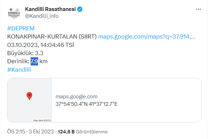 Buna göre, Kandilli Rasathanesi’nin paylaştığı verilerine göre, Siirt'in Kurtalan ilçesinde 3.3 şiddetinde bir sarsıntı meydana geldi. Saat 14:04’de ve yerin 7.9 km derinliğinde yaşanan depremin şiddeti 3.3 olarak ölçüldü.