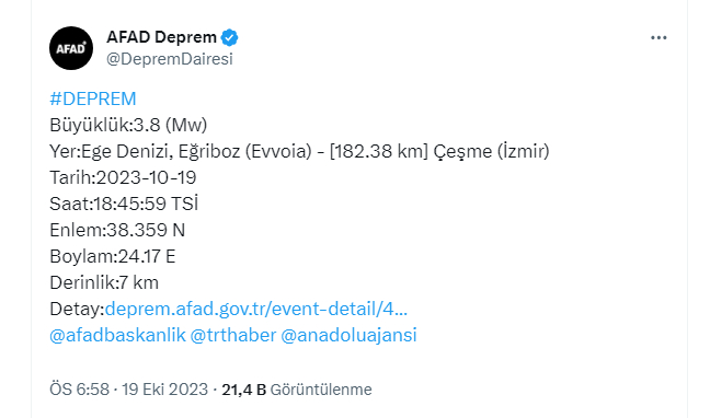 AFAD'ın son verilerine göre, Türkiye'nin Ege Bölgesi'nde yer alan İzmir'in Çeşme ilçesinde bugün saat 18:45'te bir deprem meydana geldi. Depremin büyüklüğü 3.8 olarak ölçüldü. İzmir'in Çeşme ilçesinde gerçekleşen depremin merkez üssü, yüzeyin yaklaşık 7 kilometre altında tespit edildi.