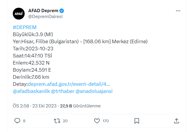 AFAD'dan yapılan son dakika açıklamasına göre merkez üssü Bulgaristan Filibe olan ama Edirne Merkez'de de yoğun bir şekilde hissedilen bir deprem meydana geldi. Depremin şiddetinin 3,9 olduğu açıklandı. Deprem saat 14:47'de yerkürenin 7.66 kilometre altında gerçekleşti.