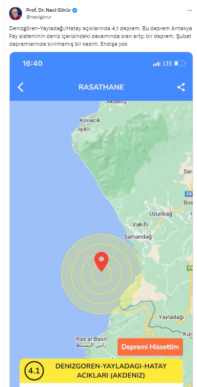 "Denizgören-Yayladağı / Hatay açıklarında 4,1 deprem. Bu deprem Antakya Fay sisteminin deniz içerisindeki devamında olan artçı bir deprem. Şubat depremlerinde kırılmamış bir kesim. Endişe yok"