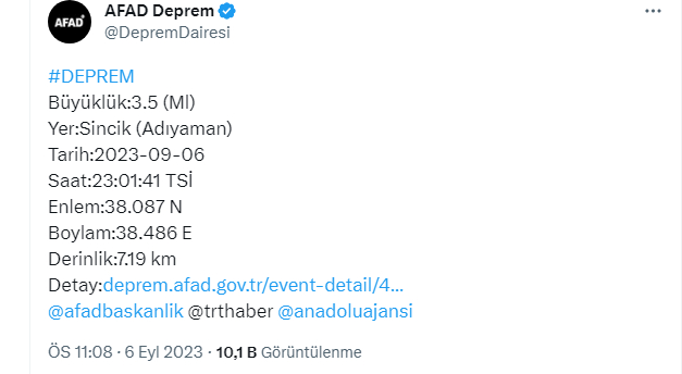Adıyaman'ın Sincan ilçesinde, AFAD tarafından yapılan açıklamalara göre, 3.5 büyüklüğünde bir deprem meydana geldi. Saat 23:01'de kaydedilen deprem, yerin 7.19 kilometre altında gerçekleşti.