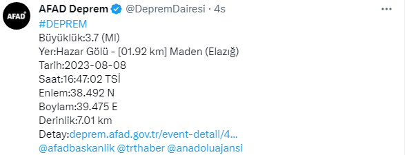 Elazığ'ın Maden ilçesinde AFAD tarafından yapılan açıklamaya göre, bugün saat 18.47'de 3,7 büyüklüğünde bir deprem yaşandı. Depremin merkez üssü yerin 7.01 kilometre derinliğinde kaydedildi.