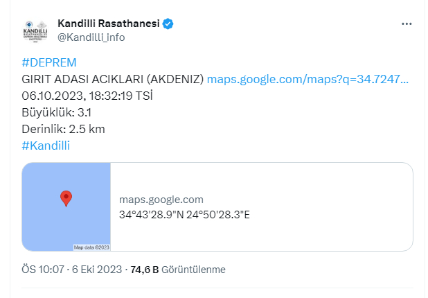 Akdeniz'de Girit Adası açıklarında, Kandilli Rasathanesi tarafından yapılan açıklamalara göre, 3.1 büyüklüğünde bir deprem meydana geldi. 6 Ekim Saat 18:32'de kaydedilen deprem, yerin 2.5 kilometre altında gerçekleşti.