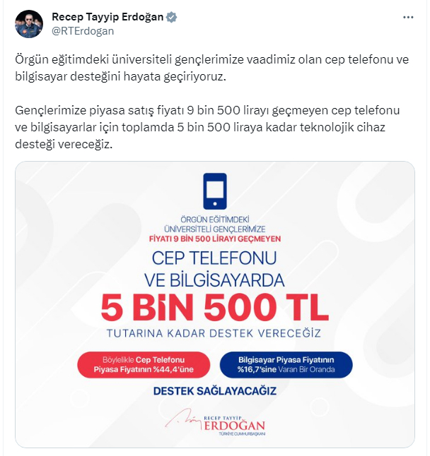 Üniversite öğrencilerine yönelik AK Parti'nin seçim vaadi olan cep telefonu ve bilgisayar desteğinin hayata geçirileceğini belirten Cumhurbaşkanı Erdoğan, ayrıntıları paylaştı. Erdoğan, "Örgün eğitimdeki üniversite öğrencilerine, piyasa satış fiyatı 9 bin 500 lirayı aşmayan cep telefonları ve bilgisayarlar için toplamda 5 bin 500 liraya kadar teknolojik cihaz desteği sağlayacağız" dedi.