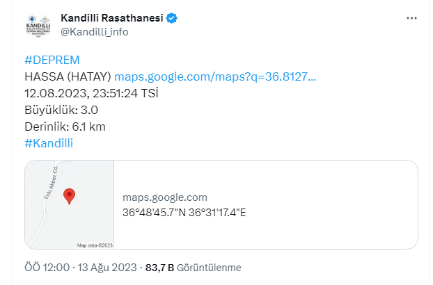 Hatay'ın Hassa ilçesinde saat 23.51’de meydana gelen deprem kısa süreli panik oluşturdu. Kandilli Rasathanesi'nin sosyal medya hesabından yaptığı paylaşıma göre 3.0 büyüklüğündeki depremin yerin 6.1 kilometre derinliğinde meydana geldiği açıklandı.