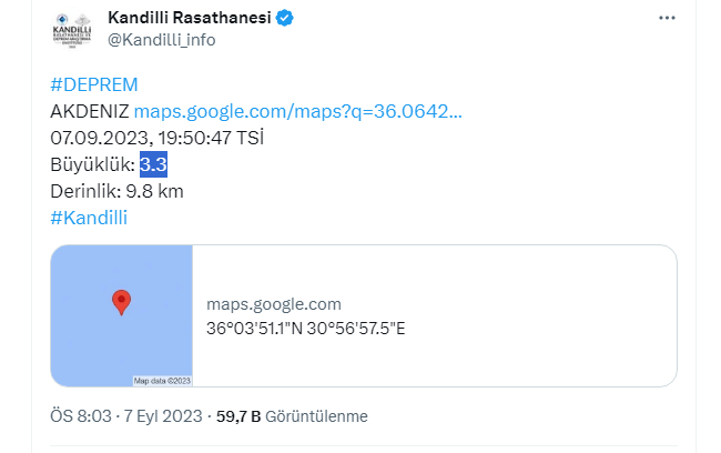 Akdeniz'de, Kandilli Rasathanesi tarafından yapılan açıklamalara göre, 3.3 büyüklüğünde bir deprem meydana geldi. Saat 19:50'de kaydedilen deprem, yerin 9.8 kilometre altında gerçekleşti.