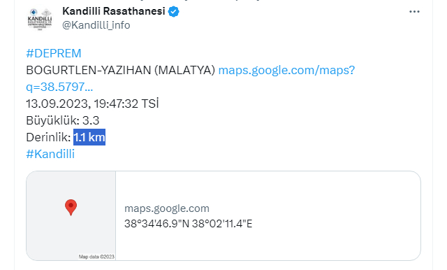 Bir süredir Malatya artçı depremlerin etkisinde. Türkiye'yi yasa boğan Kahramanmaraş merkezli depremlerin ardından Malatya'nın farklı noktalarında zaman zaman irili ufaklı depremler olmaya devam ediyor. Kandilli Rasathanesi'nden gelen bilgilere göre bugün 19:47'de Malatya bir kez daha sallandı. Merkez üssü Malatya'nın Yazıhan ilçesi olan depremin büyüklüğü ise 3.3 olarak açıklandı. Ayrıca deprem yerin 1.1 km altında gerçekleşti.