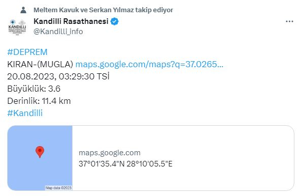 Muğla'nın Kıran ilçesinde, Kandilli Rasathanesi tarafından yapılan açıklamaya göre, bugün saat 03:29'da 3,6 büyüklüğünde bir deprem yaşandı. Depremin merkez üssü yerin 11.4 kilometre derinliğinde kaydedildi.