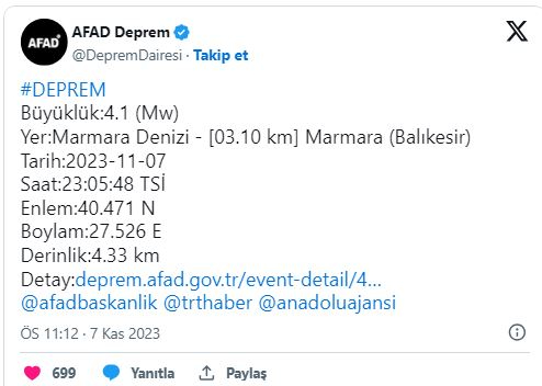 Afet ve Acil Durum Yönetimi Başkanlığı (AFAD) tarafından yapılan açıklamaya göre, Marmara Denizi bölgesinde 4.1 büyüklüğünde bir deprem meydana geldi. Deprem, birçok ilde hissedildi.