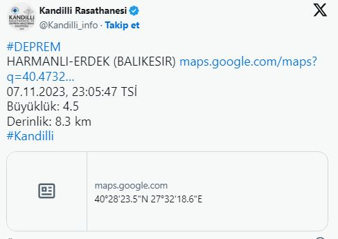 Kandilli Rasathanesi ise depremin büyüklüğünü 4.5 olarak açıklarken, derinliğini ise 8.3 kilometre olarak belirtti.