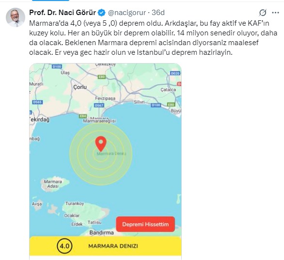 Marmara’da 4,0 (veya 5 ,0) deprem oldu. Arkdaşlar, bu fay aktif ve KAF’ın kuzey kolu. Her an büyük bir deprem olabilir. 14 milyon senedir oluyor, daha da olacak. Beklenen Marmara depremi acisindan diyorsaniz maalesef olacak. Er veya gec hazir olun ve Istanbul’u deprem hazirlayin.