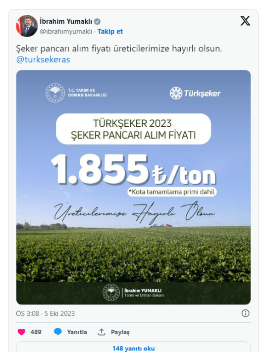 Tarım ve Orman Bakanı İbrahim Yumaklı, sosyal medya üzerinden, şeker pancarı alım fiyatıyla alakalı açıklamada bulundu.