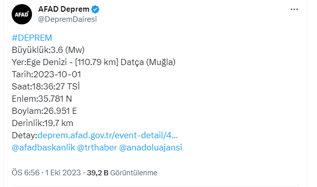 Saatler 18:36'yı gösterdiğinde ise bu kez Muğla'nın Datça ilçesinden bir deprem gerçekleşti. Muğla'nın Datça ilçesinde AFAD tarafından yapılan açıklamalara göre, 3.6 büyüklüğünde bir deprem meydana geldi. Saat 18:36'da kaydedilen deprem, yerin 19.7 kilometre altında gerçekleşti.