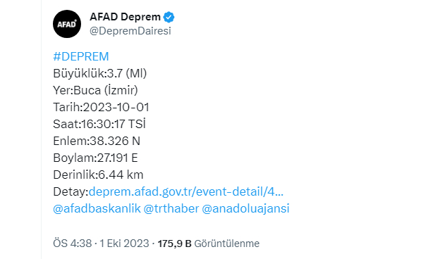 AFAD, birkaç saat arayla iki ayrı deprem haberi birden geçti. AFAD tarafından yapılan duyurulara göre önce İzmir'in Buca İlçesinde 3.7 şiddetinde bir deprem meydana geldi. Depremin merkez üssünün yerin 6.44 kilometre altında olduğu bildirildi. İzmir depremi 16:30'da gerçekleşti.
