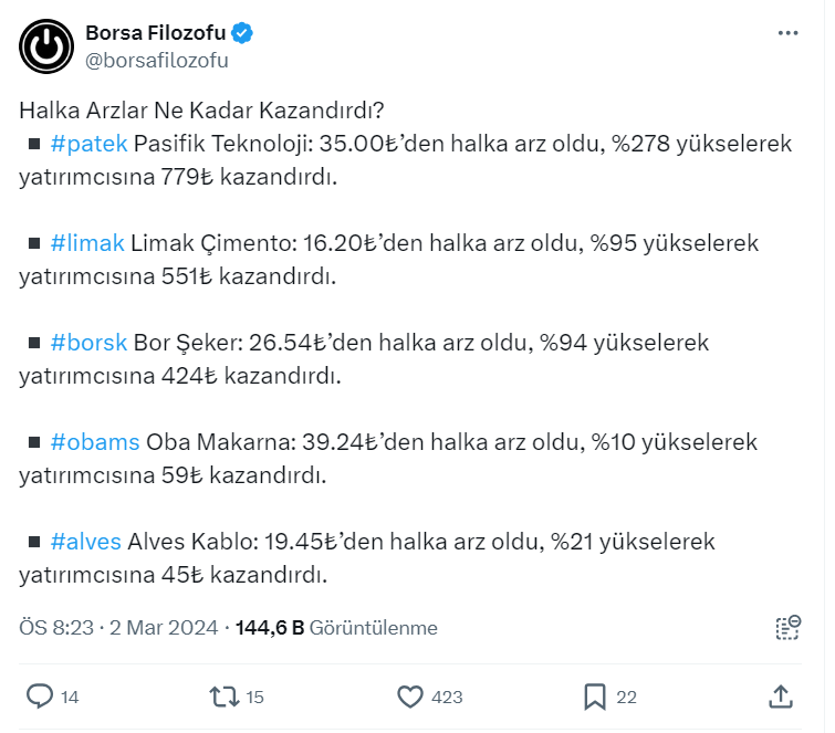 Yatırımcıların gözdesi borsa ile ilgili olarak yaptığı paylaşımlarla dikkat çeken 230,9 bin takipçili Borsa Filozofu'nun resmi X hesabı https://twitter.com/borsafilozofu üzerinden halka arzların ne kadar kazandırdığını açıkladı.