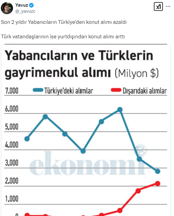 Türklerin son iki yılda yurt dışından gayrimenkul alımları artarak devam ederken yabancıların Türkiye'den konut alımları ise azalmaya başladı. İşte Furkan Yavuz'un paylaştığı o grafik...