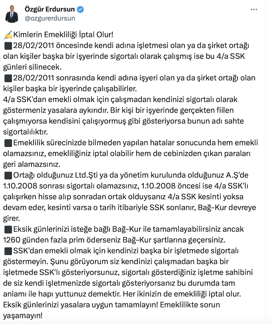 Sosyal Güvenlik Uzmanı Özgür Erdursun 'Kimlerin Emekliliği İptal Olur' başlıklı yazısını resmi sosyal medya hesabından paylaştı. Özgür Erdursun paylaşımında çok önemli bazı noktalara değindi.