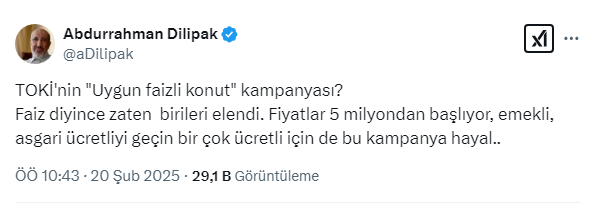 Gazeteci Yazar Abdurrahman Dilipark, sosyal medya hesabından söz konusu kampanya ile ilgili 'TOKİ'nin "Uygun faizli konut" kampanyası?' başlığı altında açıklamalarda bulundu.