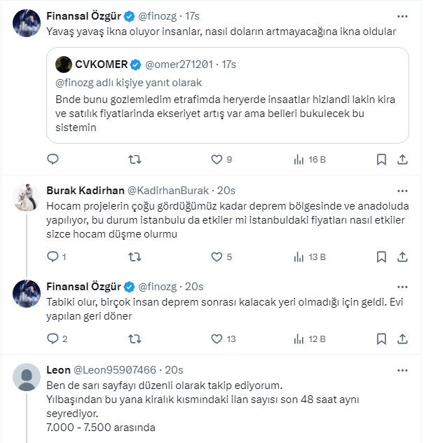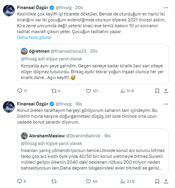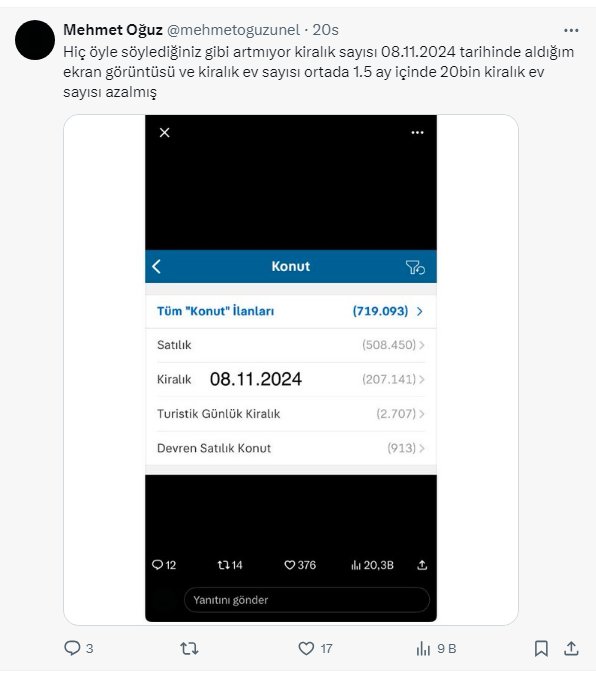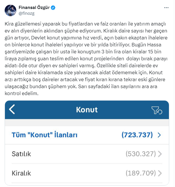 ''Kira güzellemesi yaparak bu fiyatlardan ve faiz oranları ile yatırım amaçlı ev alın diyenlerin aklından şüphe ediyorum. Kiralık daire sayısı her geçen gün artıyor, Devlet konut yapımına hız verdi, açın bakın ekaptan ihalelere on binlerce konut ihaleleri yapılıyor ve bir yılda bitiriliyor.