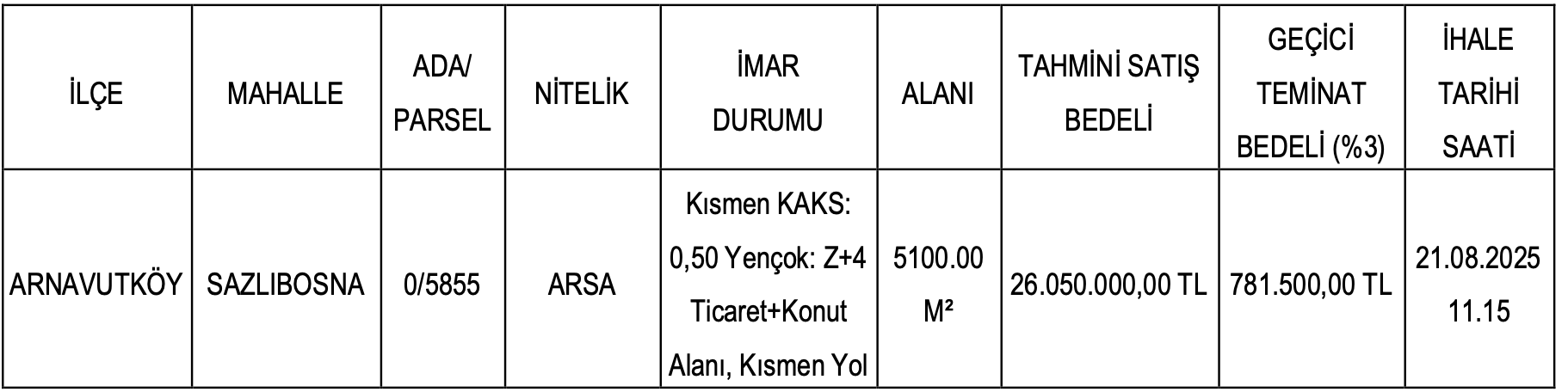 Sultangazi Belediye Başkanlığı, İstanbul Arnavutköy Sazlıbosna’da yer alan arsayı 26 milyon 50 bin TL bedelle satışa çıkardı.