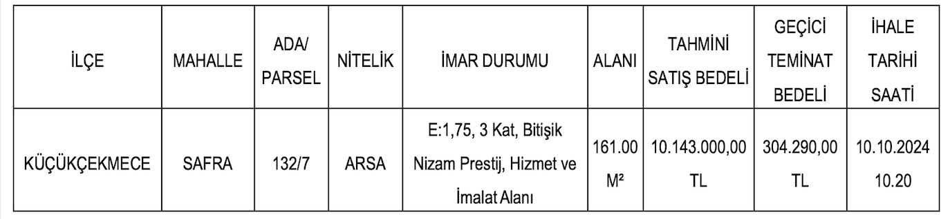 Sultangazi Belediye Başkanlığı, İstanbul Küçükçekmece’de yer alan arsayı satışa çıkardı. 3 kat, bitişik nizam prestij, hizmet ve imalat alanı imarlı arsanın satış ihalesi 10 Ekim’de yapılacak.