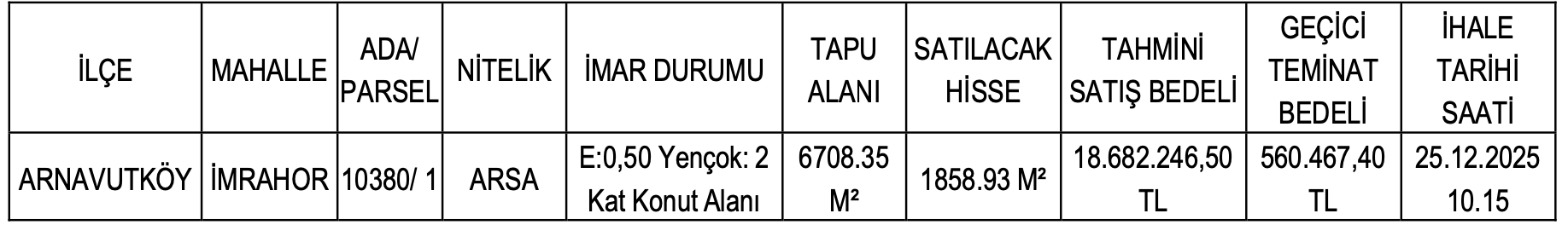 KDV’den muaf şekilde satışa çıkarılan arsanın satış ihalesi 25 Aralık 2025 tarihinde saat 10.15’te gerçekleştirilecek.