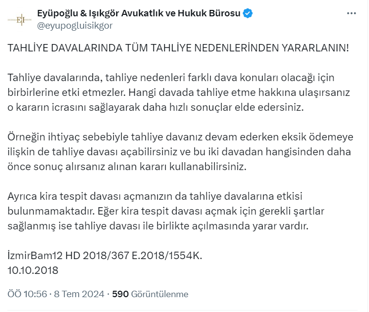 Eyüpoğlu - Işıkgör Avukatlık ve Hukuk Bürosu resmi sosyal medya hesabı https://x.com/eyupogluisikgor üzerinden yaptığı paylaşımda tahliye davalarında, tahliye nedenleri farklı dava konuları olacağı için birbirlerine etki etmezler. Hangi davada tahliye etme hakkına ulaşırsanız o kararın icrasını sağlayarak daha hızlı sonuçlar elde edileceğini belirtti.