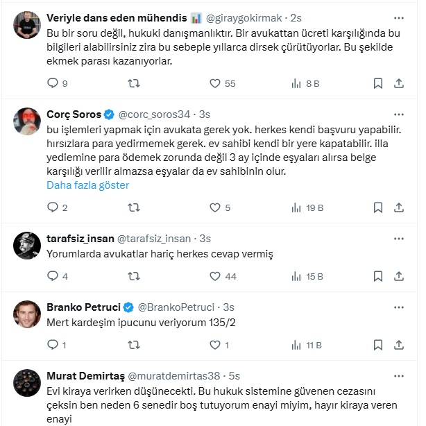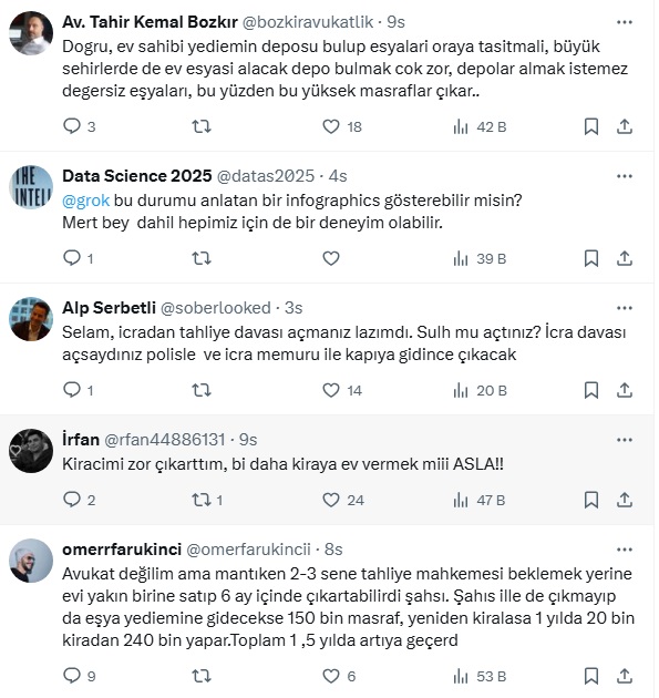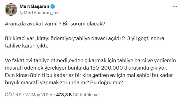Ekonomist Mert Başaran sosyal medya hesabından konuyla ilgili avukatalara soru sordu. Başaran '' Bir kiraci var ,kirayı ödemiyor,tahliye davası açıldı 2-3 yil geçti sonra tahliye kararı çıktı. Falat evi tahli etmedi.'' diyerek sonrasında ne olacağını sordu. İşte Mert Başaran'ın sosyal medya hesabından yaptığı o paylaşım ve gelen yanıtlar...