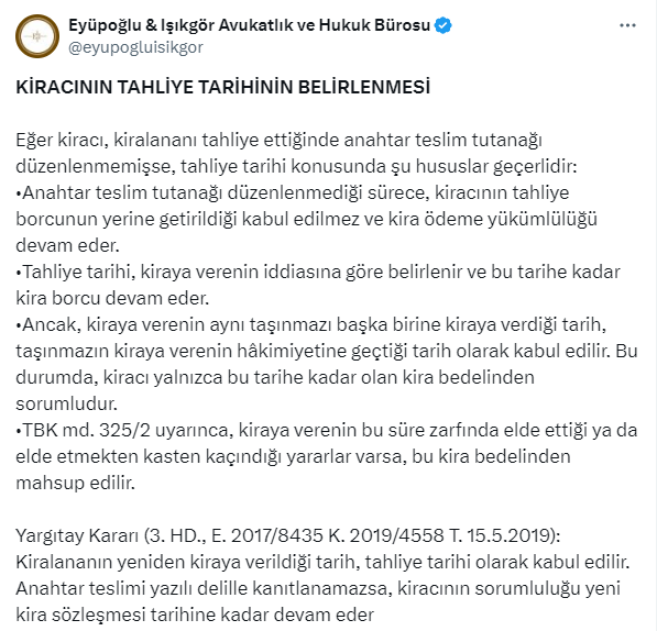 Eyüpoğlu & Işıkgör Avukatlık ve Hukuk Bürosu,eğer kiracı, kiralananı tahliye ettiğinde anahtar teslim tutanağı düzenlenmemişse, tahliye tarihi konusunda hangi hususların geçerli olacağını açıkladı. İşte o paylaşım...