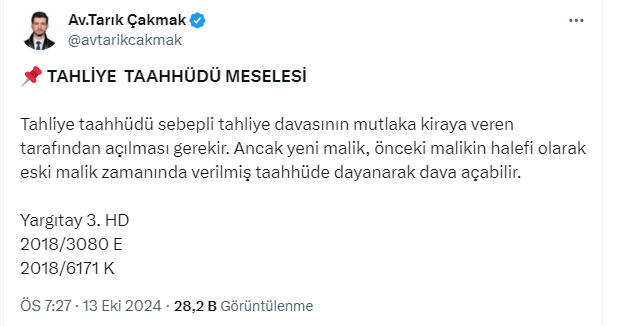 Avukat Tarık Çakmak, sosyal medya hesabından, tahliye taahhüdü sebepli tahliye davasının mutlaka kiraya veren tarafından açılması gerektiğini söyledi.
