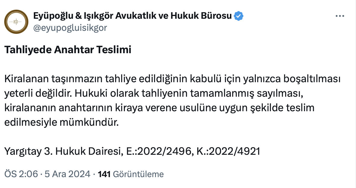Hem ev sahibi ve hem de kiracı hakları ile ilgili paylaşımları ile önemli bilgiler paylaşan detaylara değinen Eyüpoğlu - Işıkgör Avukatlık ve Hukuk Bürosu resmi sosyal medya hesabı https://x.com/eyupogluisikgor üzerinden bu kez de tahliyede anahtar tesliminin nasıl yapılacağını açıkladı.
