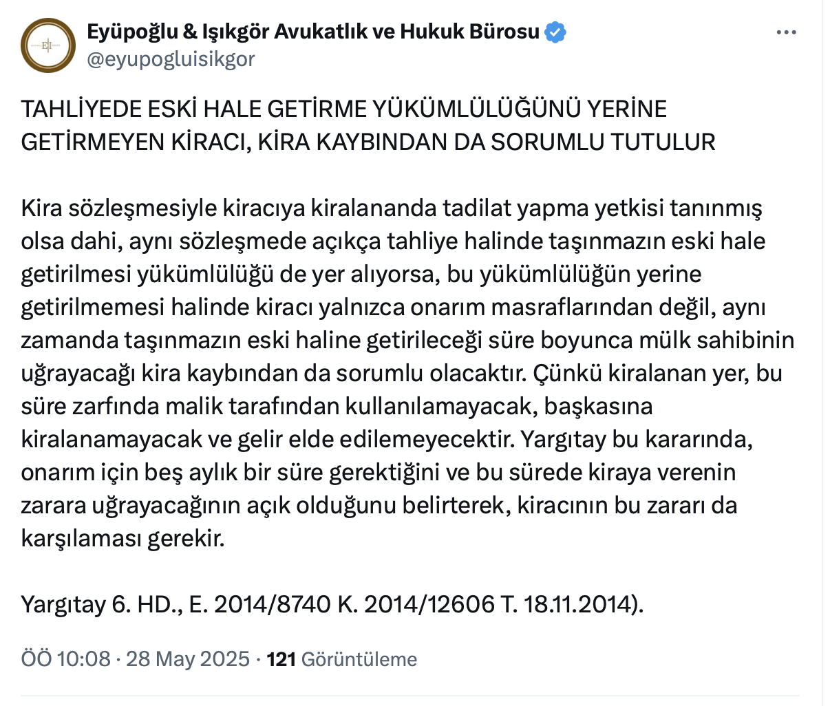 Eyüpoğlu - Işıkgör Avukatlık ve Hukuk Bürosu resmi sosyal medya hesabı https://x.com/eyupogluisikgor üzerinden yaptığı paylaşımda tahliyede eski hale getirme yükümlüğünü yerine getirmeyen kiracı, kira kaybından sorumlu tutulacağını belirtti.