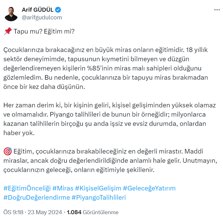 Arif Güdül, 18 yıllık sektör deneyimimde, tapusunun kıymetini bilmeyen ve düzgün değerlendiremeyen kişilerin yüzde 85'inin miras malı sahipleri olduğunu gözlemlediğini belirterek, pek çok kişinin yanıtını aradığı 'Tapu mu? Eğitim mi?' sorusuna cevap verdi.