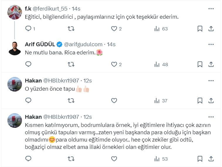 Toprak Yatırımcısı ve talepbul'un Yönetim Kurulu Başkanı Arif Güdül, resmi X hesabı üzerinden pek çok kişinin yanıtını aradığı Tapu mu? Eğitim mi? sorusuna cevap verdi. İşte Arif Güdül'ün o paylaşımı ve paylaşıma gelen yorumlar...