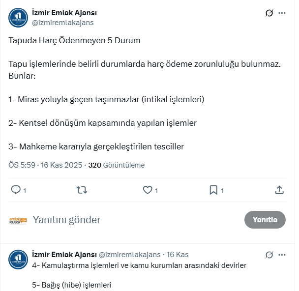 İzmir emlak piyasasının nabzını tutan İzmir Emlak Ajansı, sosyal medya hesabından tapuda harç ödenmeyen 5 durumu açıkladı.